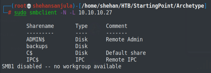 sudo smbclient -N -L 10.10.10.27-N : Don't ask for a password