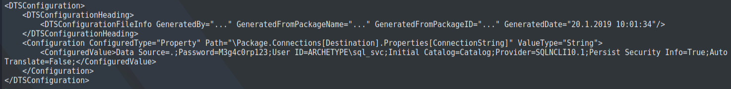 smb: \> more <file-name> : View the text fileNow we can open prod.dtsConfig file and yeah that โprod.dtsConfigโ file contains a SQL connection string, containing credentials for the local Windows user ARCHETYPE\sql_svc ๐ฅ.
