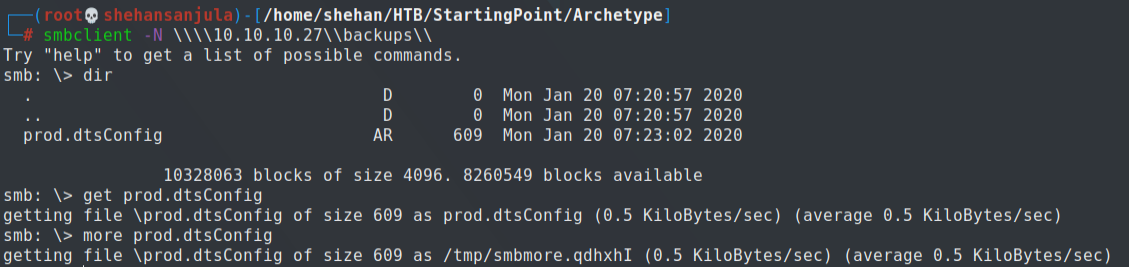 smbclient -N \\\\10.10.10.27\\backups\\So now we are ended up with the SMB shell and, there is a file called prod.dtsConfig. So let's download it.