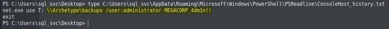 Did you remember? now we are in a service account called sql_svc. It's good practice to check recently accessed files/executed commands (Keep in mind as good practice). ย Mostly (default) our console history will be saved in